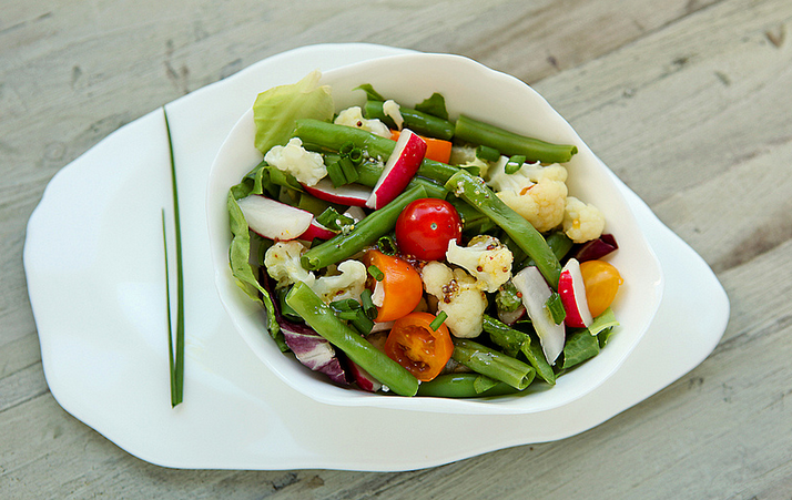 Snij de bloemkool in piepkleine roosjes en stoom ze gedurende 5 minuutjes (blancheren in bijna kokend water gaat ook). Maak de boontjes schoon en stoom ze 8 minuutjes.Ā Was de radijsjes en snij ze in 6 stukjes. Snij de tomaatjes middendoor.