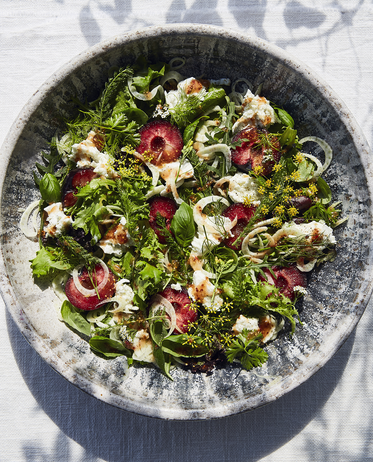 Salade met verse pruimen, venkel, wilde kruiden en mozza