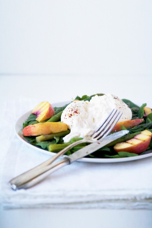 Burrata is met room ingespoten mozzarella en wat ons betreft de hemel op kaasgebied. Vaak wordt het geserveerd met olijfolie, balsamico azijn, tomaatjes en basilicum, maar het is ook heerlijk door een salade. Zo maakte Renée Kemps een lekker recept met onder andere gegrilde perziken en groene asperges. Jum!