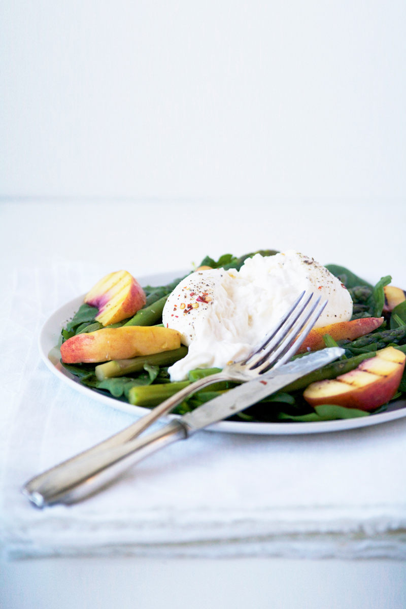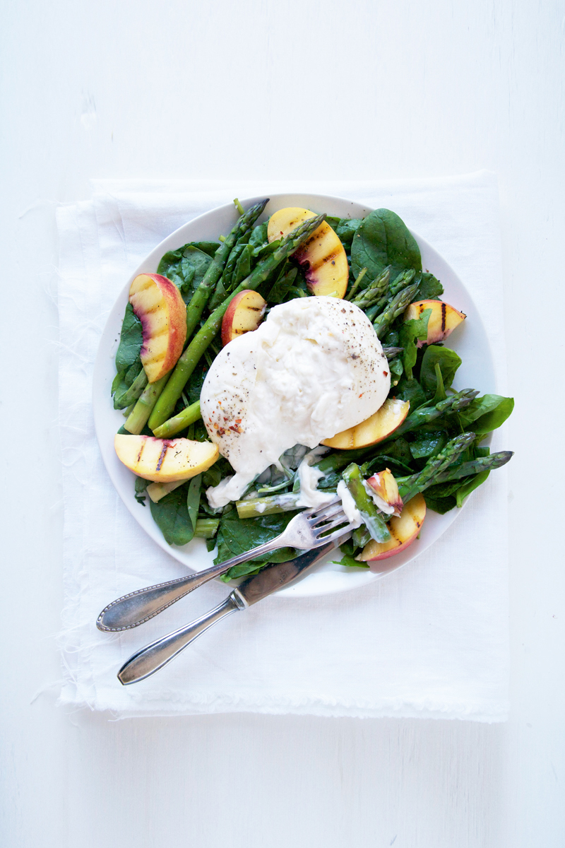 Verwarm een grillpan en leg hier de perziken en asperges op. Grill een paar minuten en herhaal voor de andere kant tot ze beetgaar zijn. Verdeel de spinazie over een schaal en verdeel hier de asperges en perziken over. Leg de bol burrata in het midden.