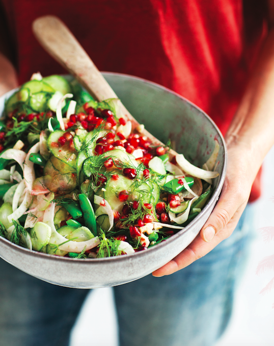 Kan je spijsvertering wel een boost gebruiken? Deze salade van venkel, met komkommer, sugarsnaps en een frisse dressing van granaatappel en limoen is good for you! Dit recept is samengesteld door Ayurvedisch therapeut Bianca Fabrie en komt rechtstreeks uit haar kookboek Holy happy belly. Bij de oudste Indiase geneeswijze draait alles om balans, dus ook die van je spijsvertering.