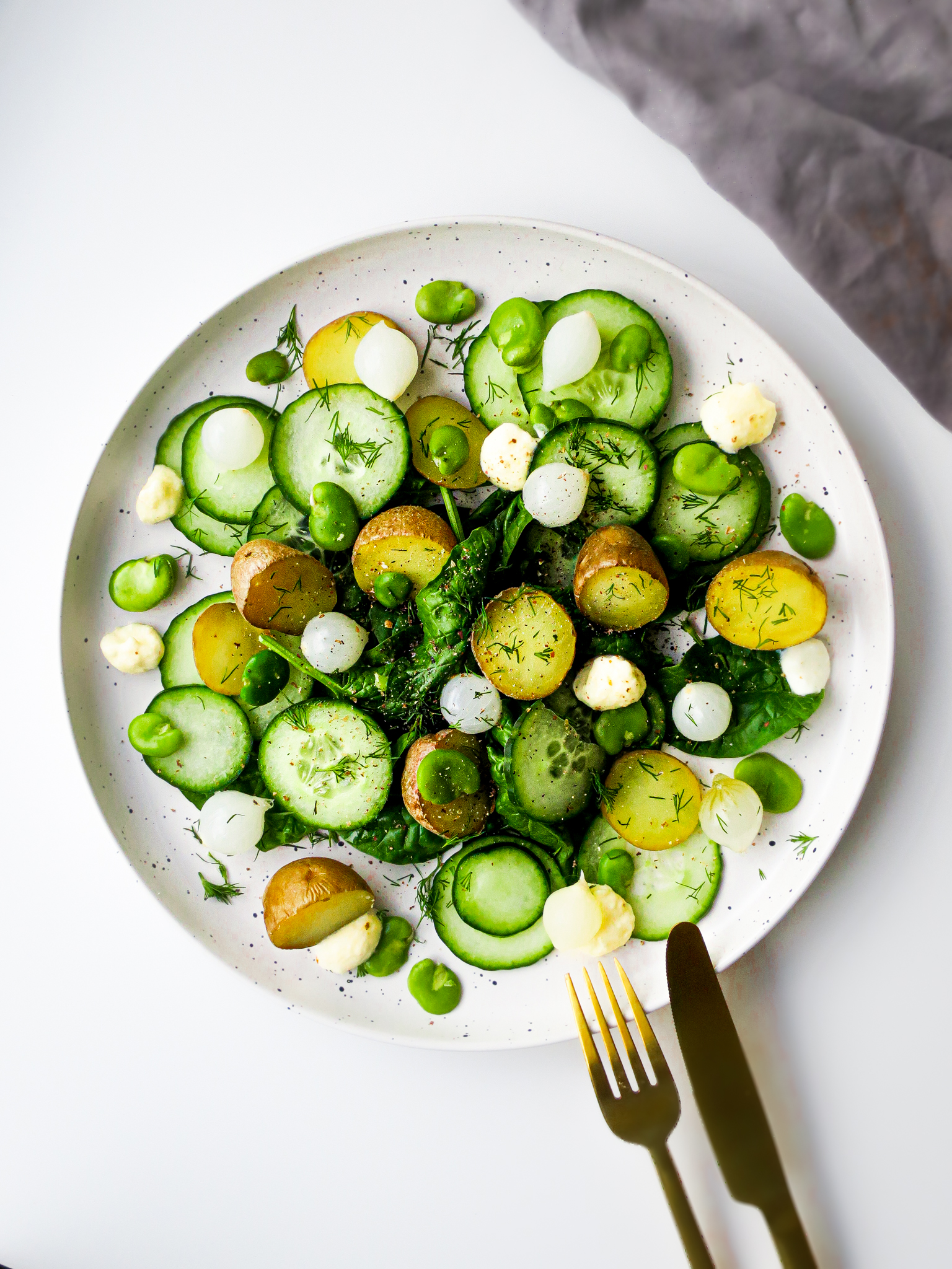Schik de spinazie, de komkommer, de krieltjes, de zilveruitjes en de tuinbonen op een bord. Kruid af met verse peper.