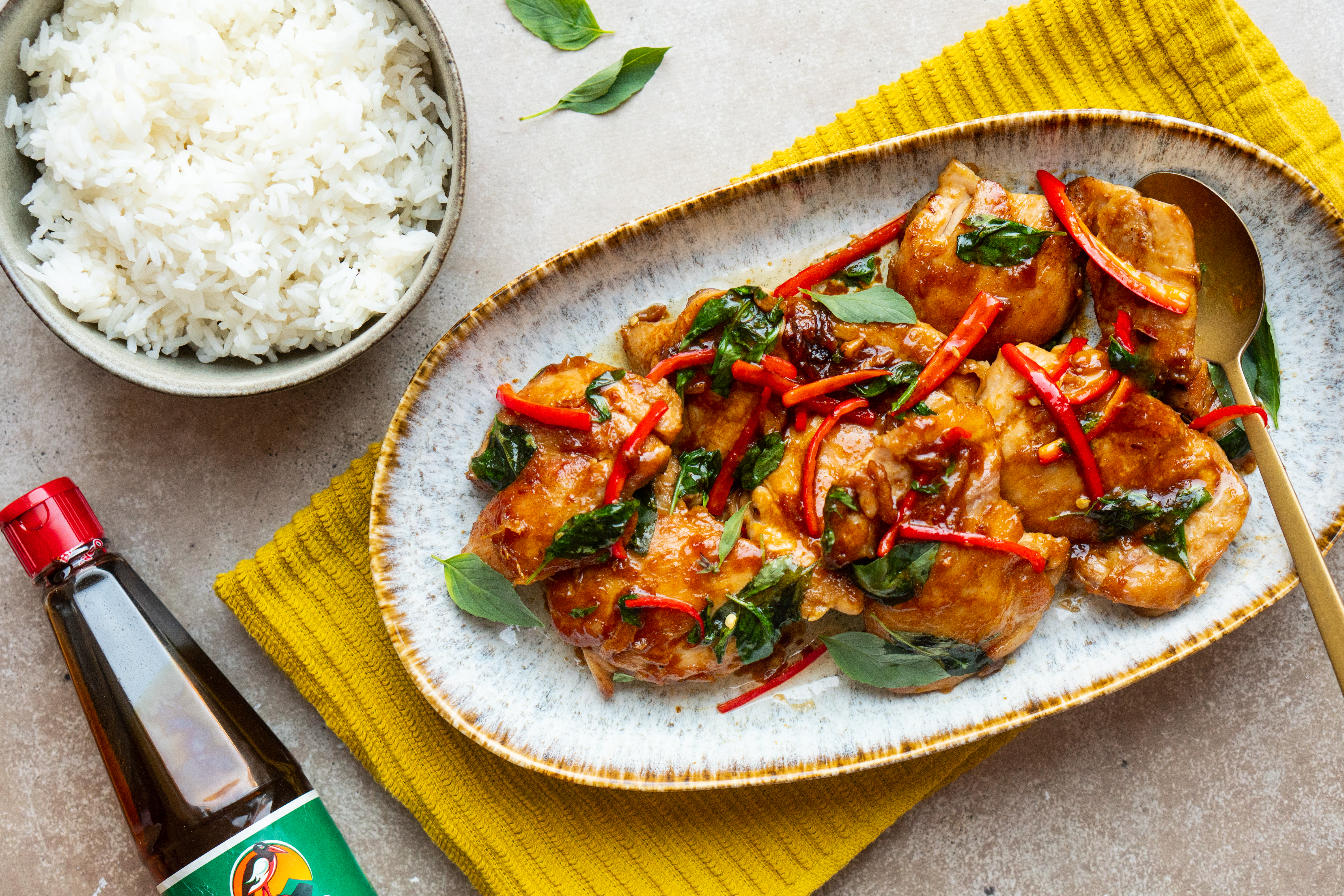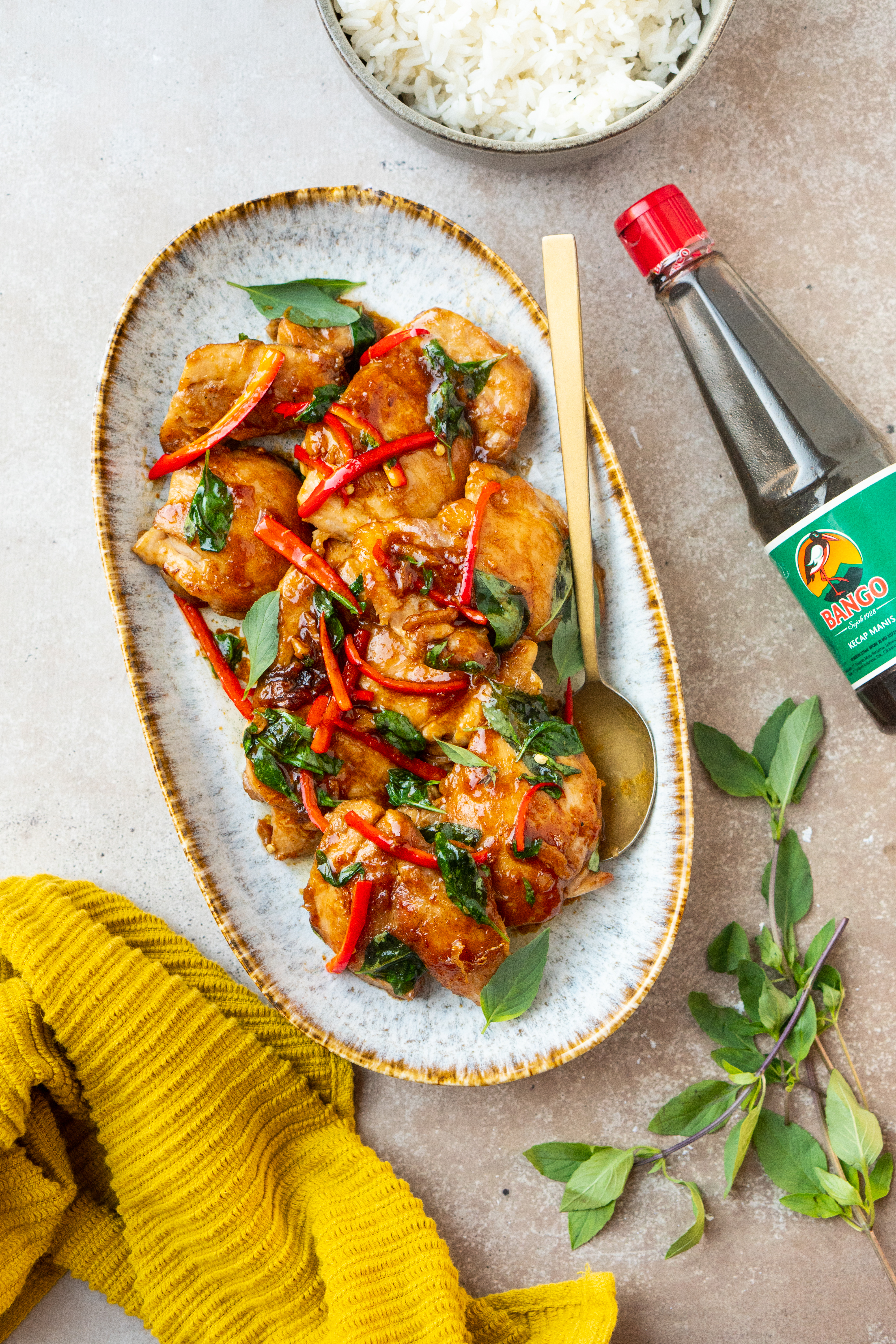 Je hoeft je zéker niet aan de “three cup” stelregel te houden voor dit recept. Experimenteer net zolang tot je jouw favoriete versie te pakken hebt. Wij vinden ‘m erg lekker met verse Thaise basilicum. Kun je dat niet krijgen, vervang die dan eventueel door wat verse koriander, of laat ‘m weg.