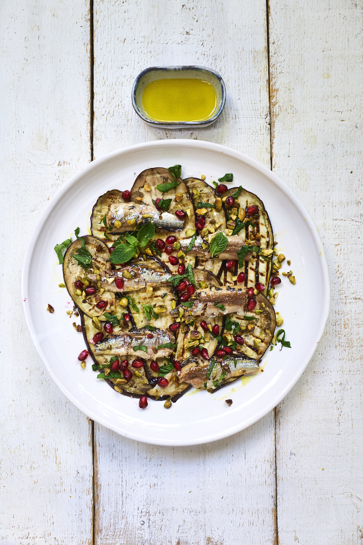 Aubergine met granaatappelpitjes en sardines van Fish Tales