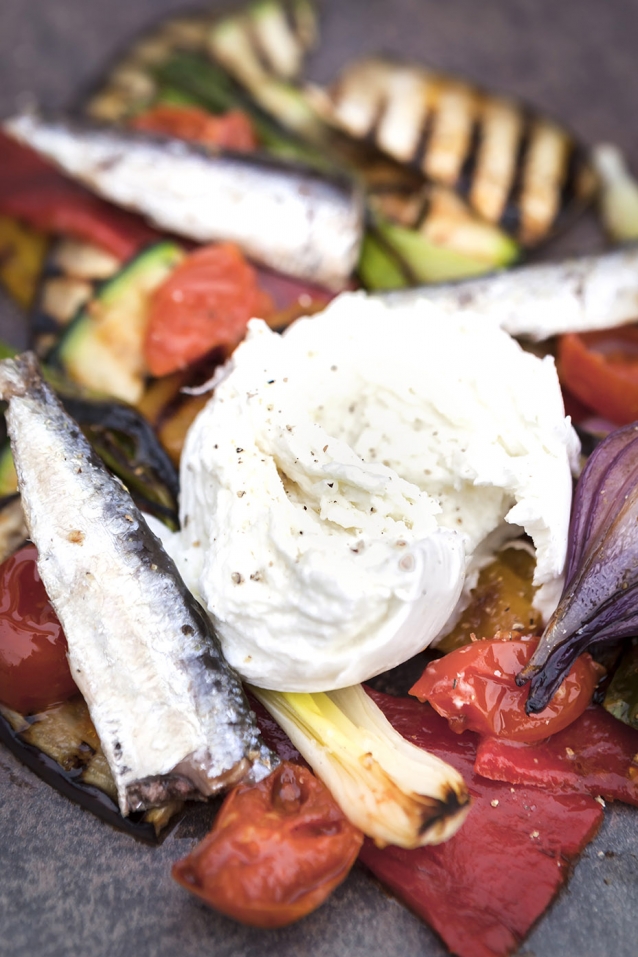 Leg de groenten, tomaat en chorizo op een groot bord. Leg de burrata of de mozzarella op de groenten en breng de schotel op smaak met zeezout en zwarte peper. Dien op met de sardines en parten citroen.