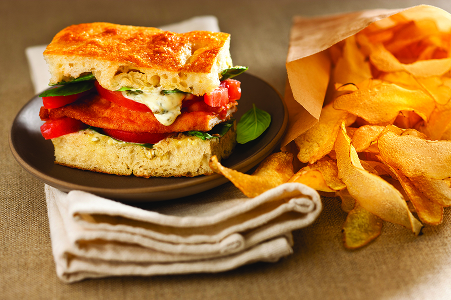 Snijd voor 1 grote sandwich de focaccia horizontaal doormidden. Bestrijk de snijvlakken met kappertjesmayonaise. Beleg de onderste helft met blaadjes basilicum en de helft van de gemarineerde tomaten en leg er een kipschnitzel op. Leg de resterende gemarineerde tomaten erop en voeg nog wat blaadjes basilicum toe. Leg de bovenste helft van de focaccia erop. Snijd de sandwich in vier gelijke stukken en serveer met aardappelchips.