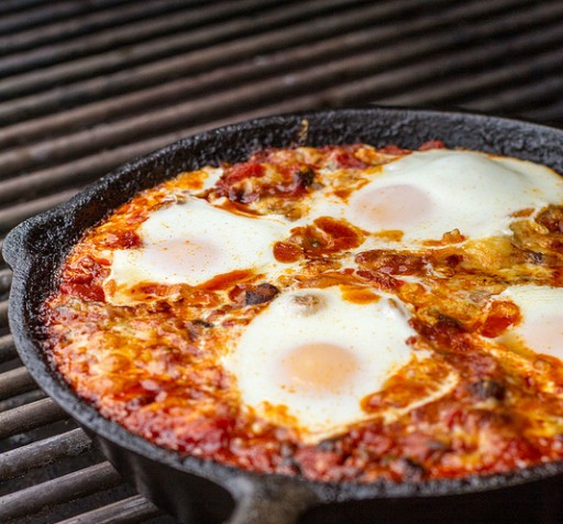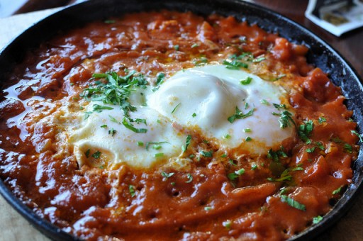 Eigenlijk weet niemand precies waar het gerecht oorspronkelijk vandaan komt. Sommigen zeggen Tunesië, anderen zeggen Jemen en weer anderen hebben het over Ottomaanse Rijk. Wat we wel weten, is dat het gerecht gemaakt wordt met eieren die worden gepocheerd in een pittige saus op basis van tomaten, chili pepers, uien en vaak komijn.