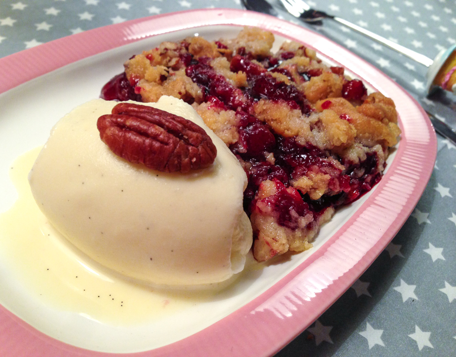 Serveer de kersencrumble warm met het vanille-ijs en garneer met een pecannootje.