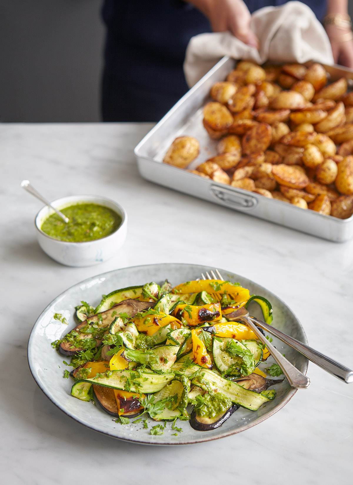 Ella: “Dit is weer zo’n makkelijk salade voor bij je wekelijkse avondmaaltijden. Wij maken hem met aubergine, courgette en paprika, maar het kan met alle groenten. Het is dan ook een fijne manier om restjes en seizoensgroenten te gebruiken.