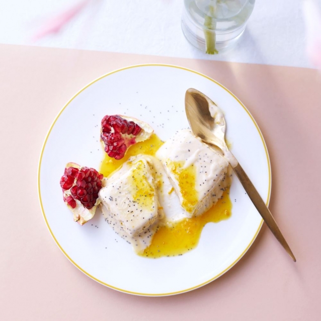 Stort de semifreddo’s en giet er wat sinaasappelsiroop omheen. Bestrooi met granaatappelpitten en extra maanzaad.