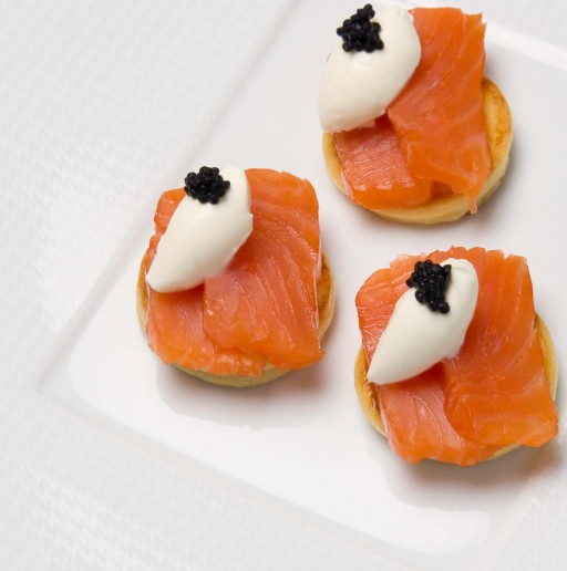 - Snijd de zalm in dunne plakjes en leg twee plakjes zalm op de blini’s. Maak een quenelle van de crème fraiche met een warme theelepel.