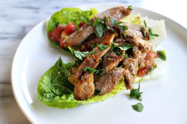 Slaschuitjes met schouderkarbonade en avocado-banaansalsa