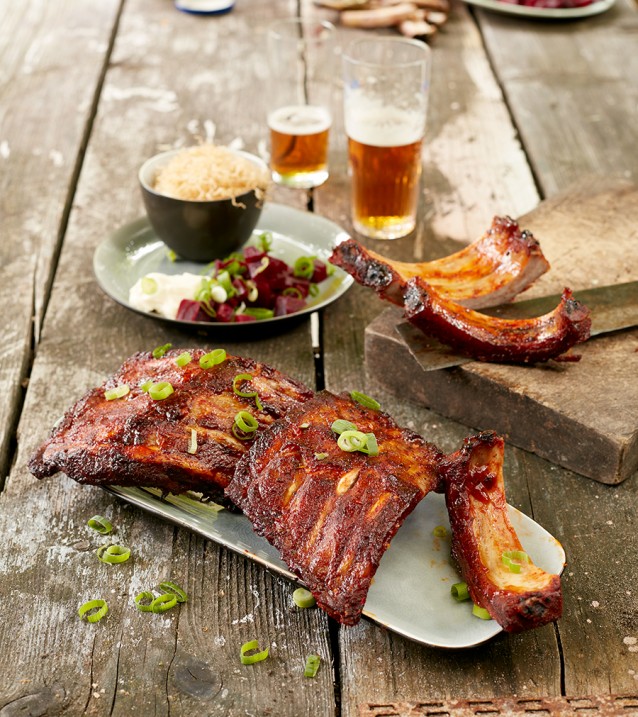 Serveer ze met de gefrituurde zuurkool, de mierikswortelmayonaise en de bietblokjes met uienringetjes.
