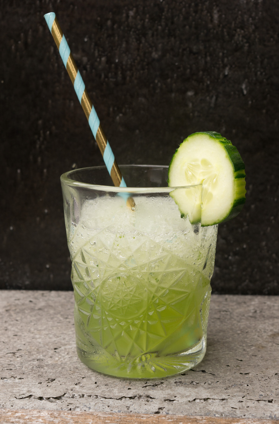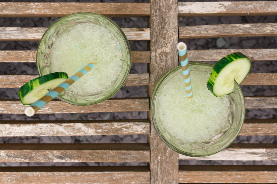 Verdeel de slush puppy met gin over de ijskoude glazen en plaats een schijfje komkommer op de rand. Cheers!
