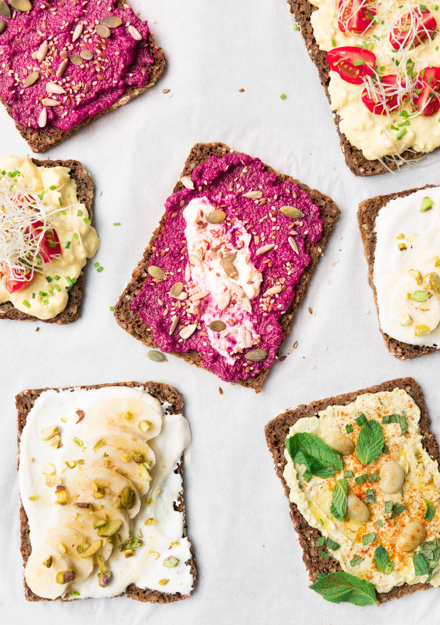 Het leukste is natuurlijk om de eters aan je ontbijt- of brunchtafel te verassen met een smörgâsbord aan smörrebröd. Oftewel: zo veel mogelijk smaken en kleuren. Wij maakten daarom vier versies: tuinbonen hummus, bieten hummus, eiersalade met kerrie én een zoete variant van ricotta met banaan, honing en pistachenoten.