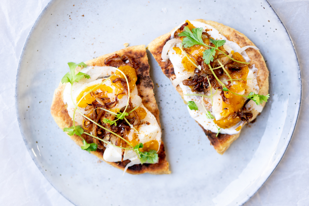 Snelle flatbreads met yoghurt, ei en gekarameliseerde ui