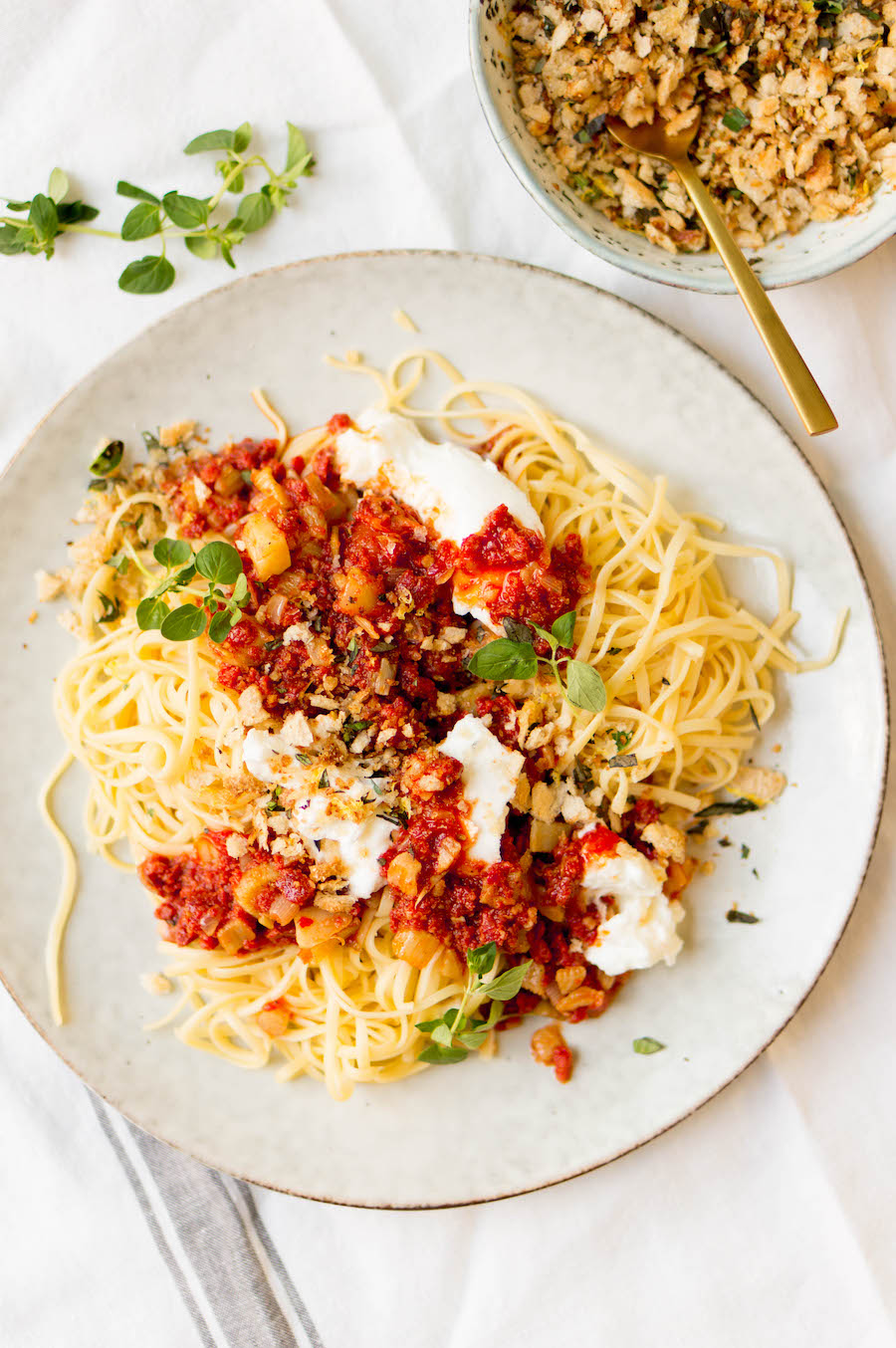 Schep de linguine op de borden en verdeel de bolognese erover. Scheur de mozzarella in stukjes en verdeel die over de pasta. Maak elk bord af met wat pangrattato en eventueel nog wat geraspte Parmezaanse kaas.