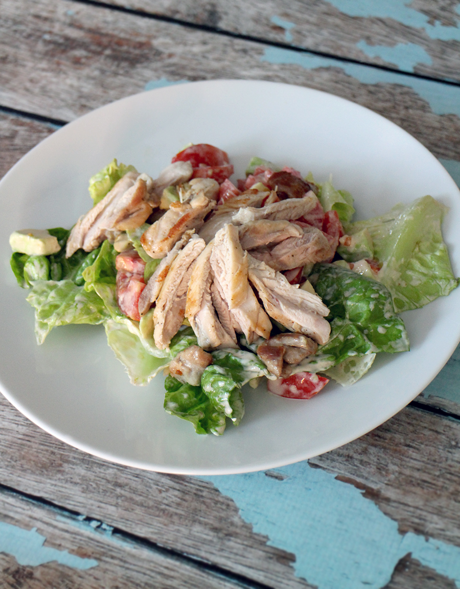 Was je favoriete sla-soort en maak aan met de Caesar-dressing (niet té ver van tevoren, dan wordt de sla slap). Snijde avocado in blokjes en halveer de cherrytomaatjes. Meng deze door de sla en kruid met peper en zout.