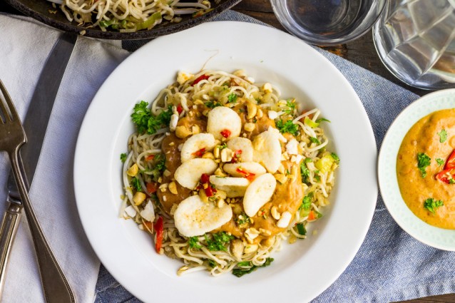 Snelle vegetarische bami met satésaus