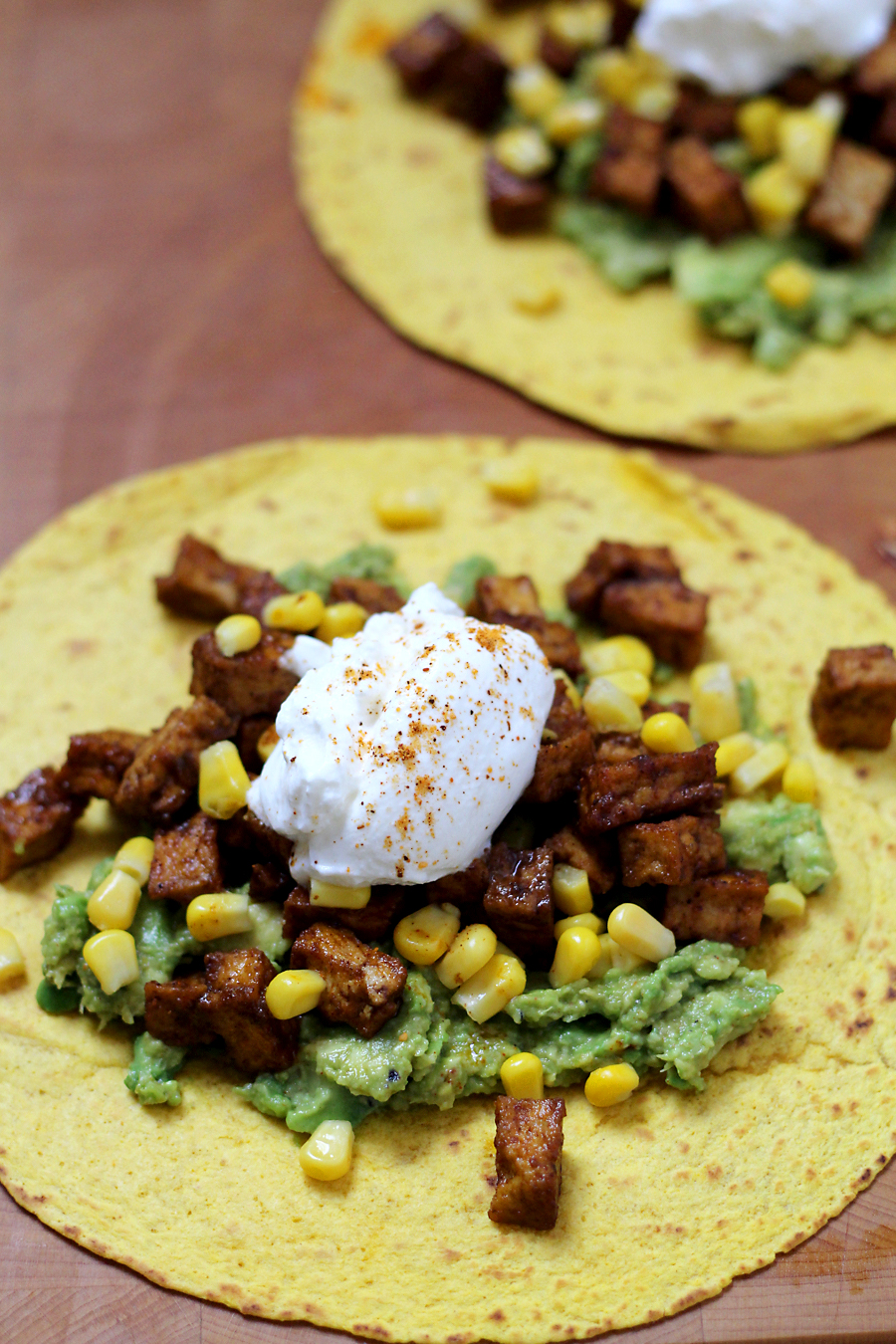 - Verwarm de tortilla’s kort in een goede hete (droge) koekenpan. Besmeer de tortilla’s vervolgens met de guacamole en beleg met de krokante tofu en de mais.