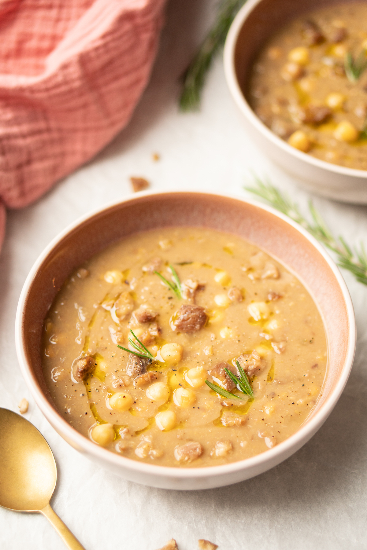 Deze soep met kikkererwten en kastanjes heeft misschien niet de mooiste kleur, maar ugly delicious is het nieuwe culinaire zwart (vraag maar aan David Chang), dus wat zou het? En kikkererwten en kastanjes zijn toevallig een héle lekkere combinatie. Een eenvoudig recept met een verrassend resultaat!