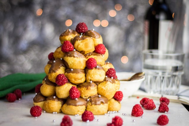 Doe dit met alle soesjes en bouw op deze manier een stevige toren. Probeer snel te werken zodat de chocolade nog vloeibaar is en de soesjes aan elkaar blijven plakken. Garneer met de frambozen en voeg eventueel zilveren of gouden sprinkles toe voor een extra feestelijk effect.