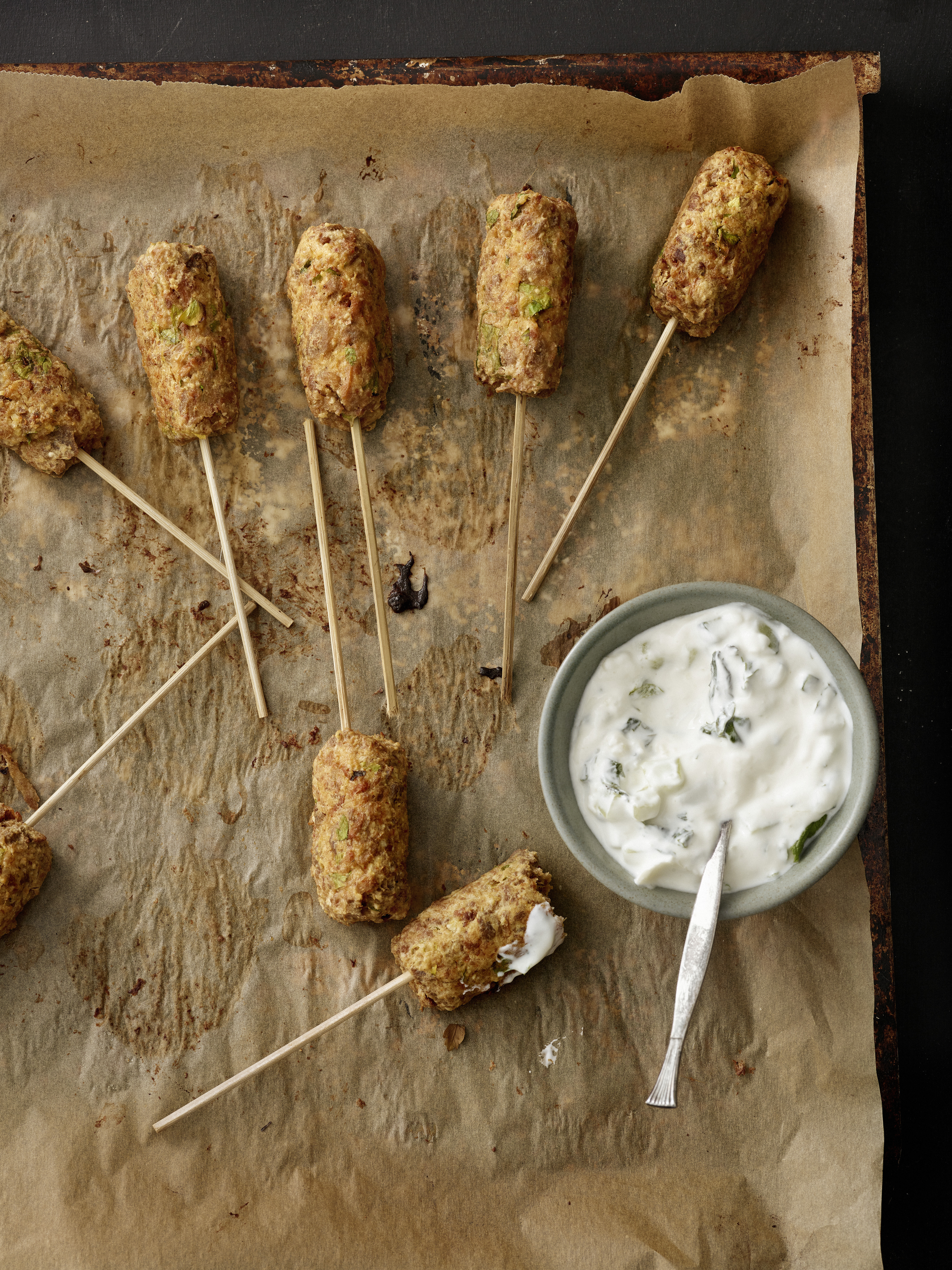 Vegetarische Turkse spiesjes van pulled oats met tzatzikidip