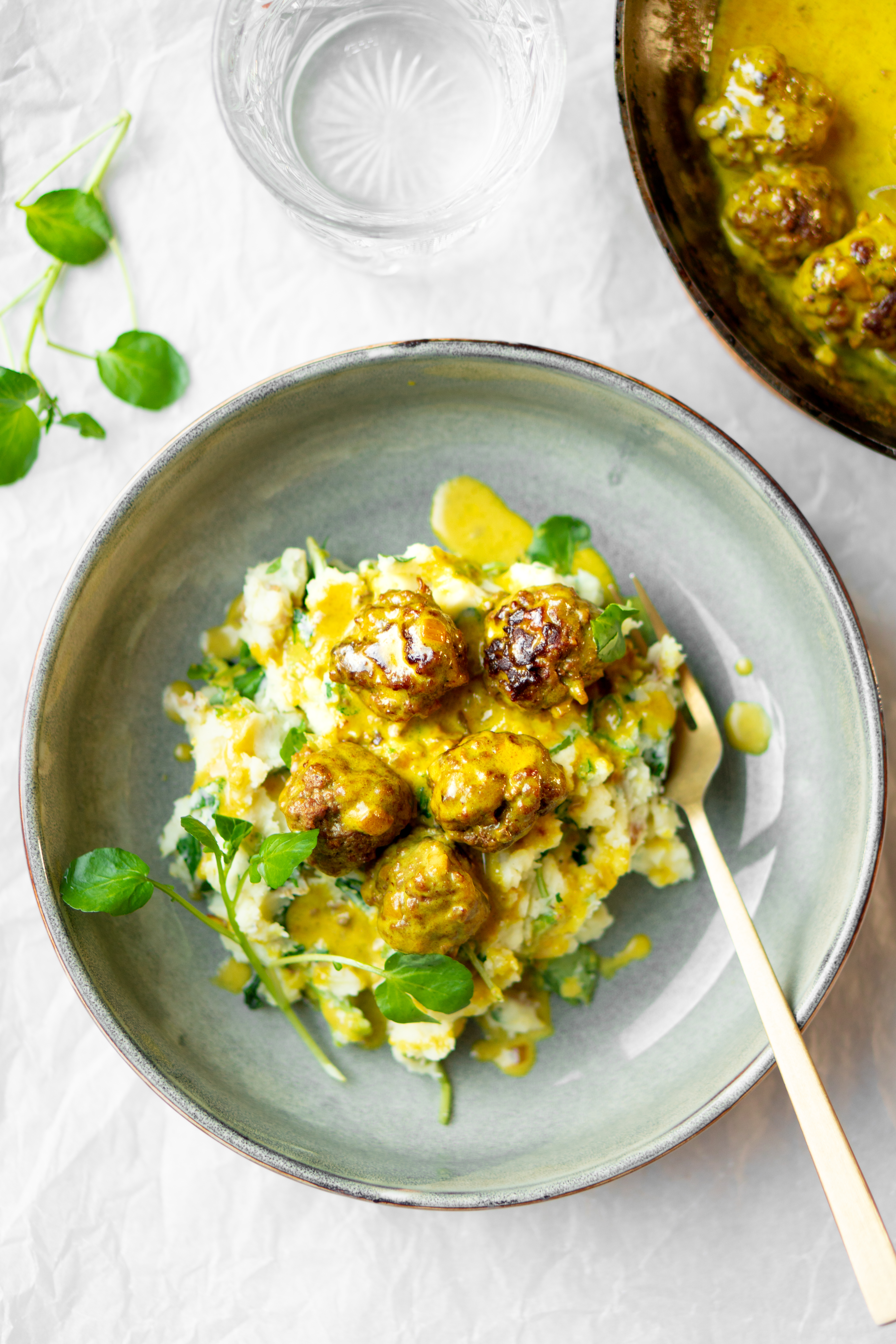 Giet een plensje olijfolie in een hapjespan op middelhoog vuur en bak de balletjes rondom bruin, in ongeveer 5 minuten. Voeg de kerrie en kurkuma toe, giet er een flinke scheut van de room bij (houd eventueel nog wat achter voor de stamppot) en laat 5 minuten zachtjes pruttelen tot de gehaktballetjes gaar zijn en de saus ietwat is ingedikt.