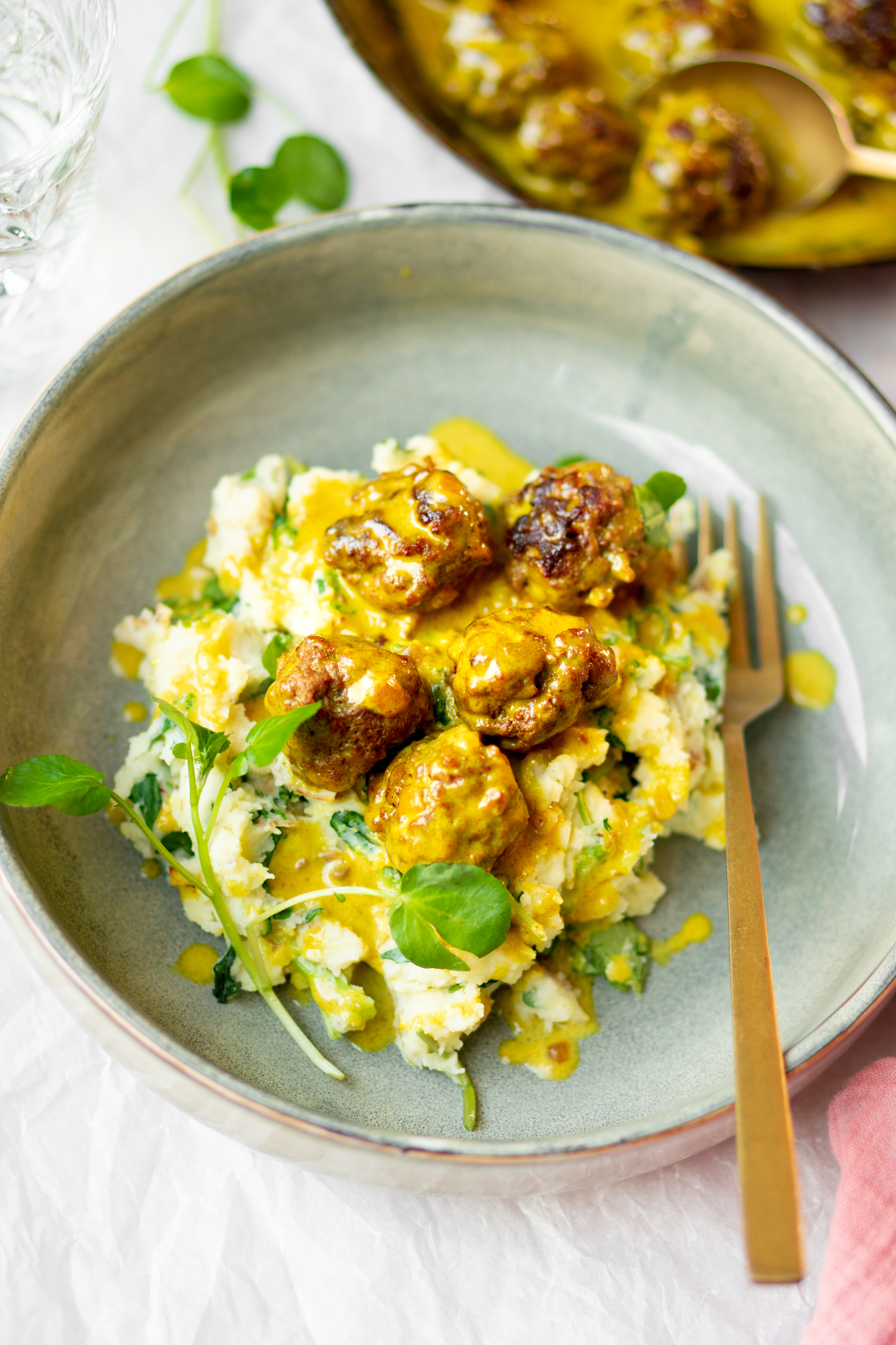Serveer de stamppot met de kerrieballetjes en een flinke schep van de saus.