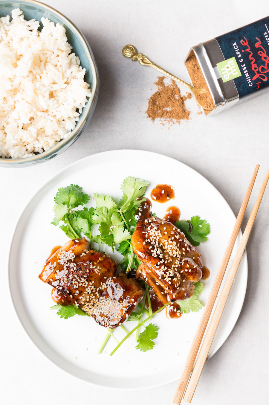 Zo simpel, maar zo lekker: krokante kip met een kleverige saus van five spice en chilisaus.