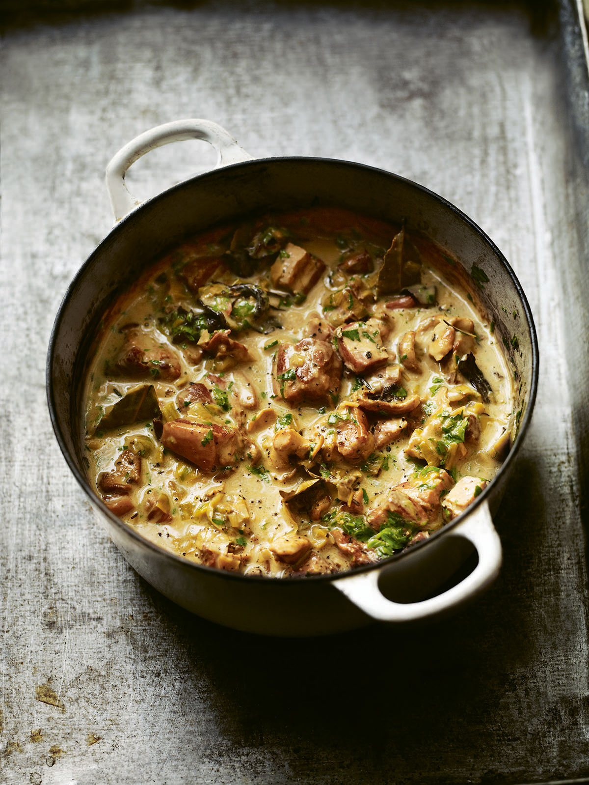 Stoofpotje van buikspek, spekblokjes & paddenstoelen met room, cider & peterselie