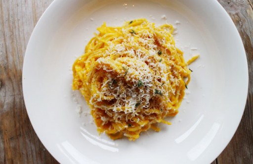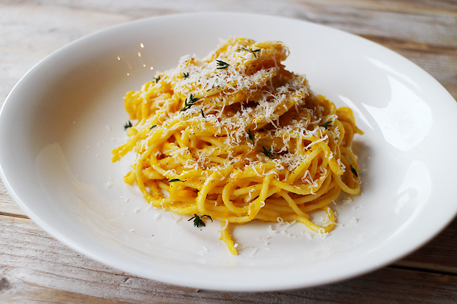Houd de crème warm in een pannetje en kook ondertussen de pasta. Doe de pasta bij de pompoensaus, samen met een scheutje olijfolie. Serveer met Parmezaanse kaas, eventueel wat gebakken spekjes en extra zwarte peper.