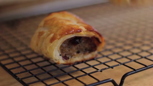 Meng het worstvlees, de kruiden, paneermeel, grove mosterd, cranberries, bacon en zout en peper in een kom. Verdeel het mengsel in twee delen. Wikkel elk deel in plastic folie en rol tot een lange worst, met ongeveer dezelfde lengte als het bladerdeeg. Leg de twee rollen in de koelkast en laat ongeveer een uur opstijven.