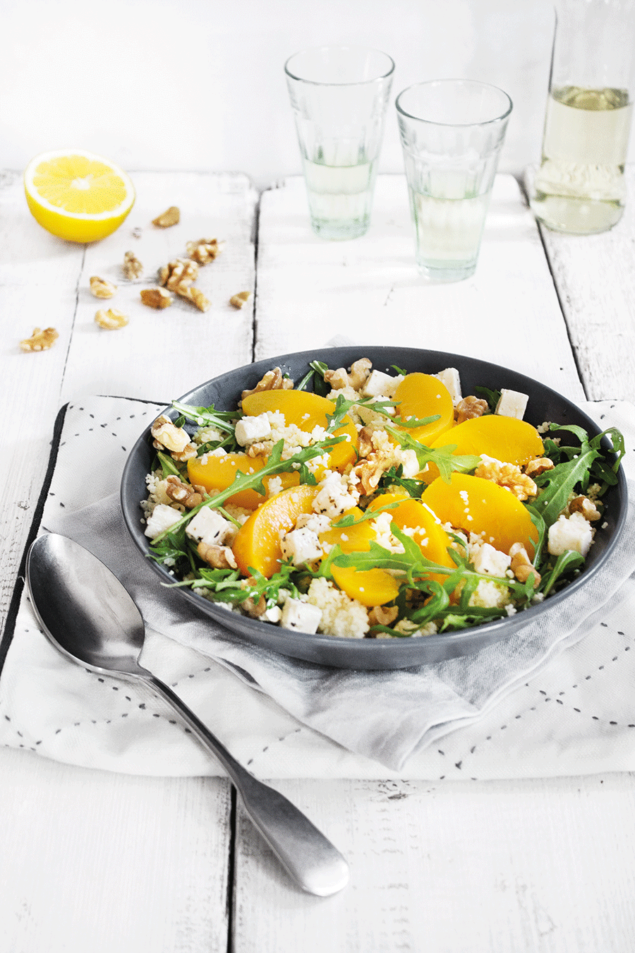 Voeg de rucola en de feta toe aan de couscous en roer goed door. Schil de perziken, verwijder de pit en snijd in parten. Verdeel de perzikparten over de couscoussalade. Hak de walnoten grof en strooi ze over de salade. En dan – ja, echt – is je couscoussalade al ready to serve.