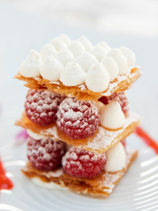 Klop de slagroom luchtig met de suiker en doe in een spuitzak. Leg vier stukjes bladerdeeg op vier borden en zet hier vijf frambozen op. Spuit een beetje slagroom hiertussen en top met een volgend stukje deeg. Herhaal dit en top de tompoezen met kleine toefjes slagroom.