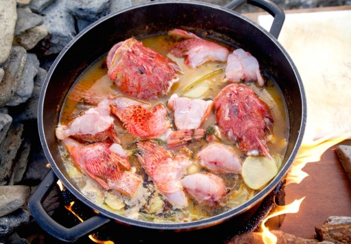 Breng het vuur omhoog tot het weer suddert. Als de aardappelen halfgaar zijn voeg je de vis toe. Vergeet de kop niet! Door het laten zitten van de botten ontstaat er een soort gelatine die zorgt voor een heerlijke dikheid van je Suquet.