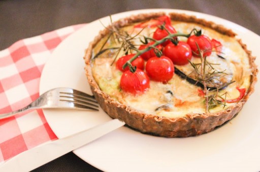 Mix nu de eieren, melk, nootmuskaat, peper en zout door elkaar. Haal de taartbodem uit de oven en verdeel de groenten over de vormen. Hou de gorgonzola, rozemarijn en eventuele tomaatjes apart.