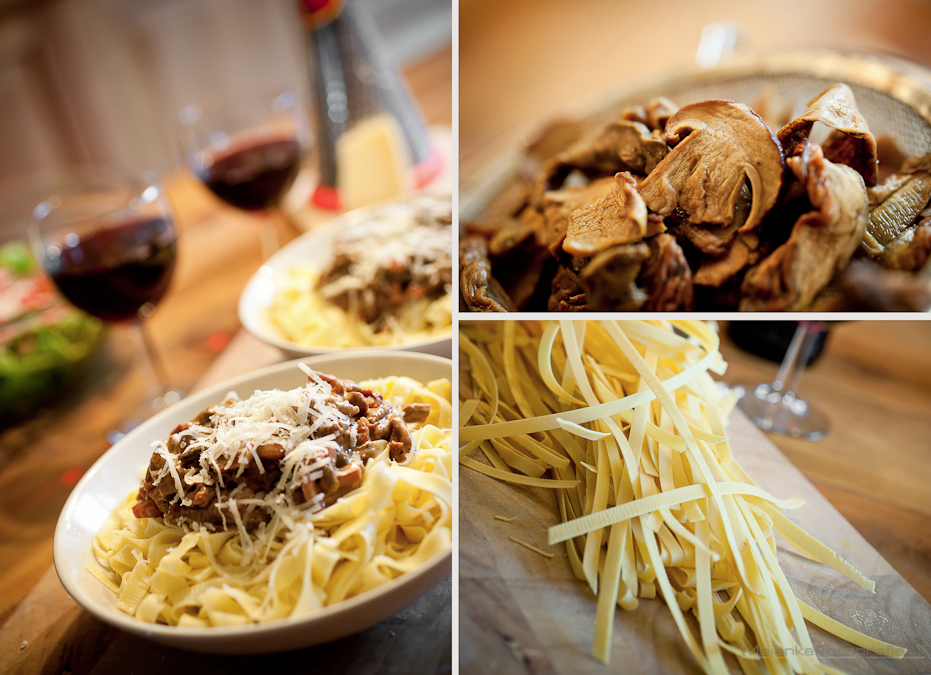 Week de paddestoelen in lauwwarme witte wijn. Dit kost ongeveer een half uurtje, ik heb het de hele middag laten trekken. Haal ze uiteindelijk uit de wijn knijp ze voorzichtig uit en snijdt ze in stukjes. Bewaar het weekvocht, die gebruik je straks in de saus. Zet een pan met water voor de pasta op.