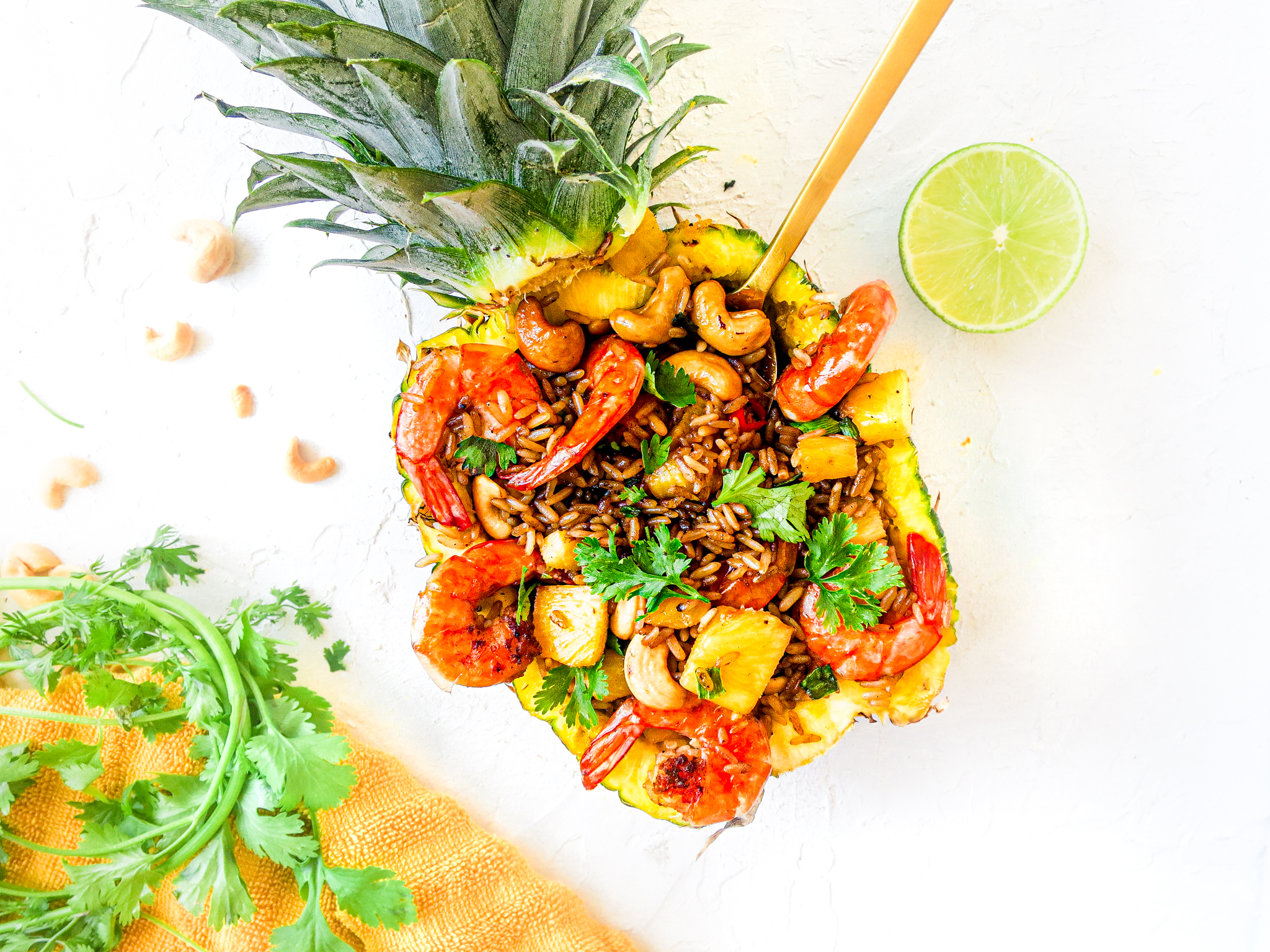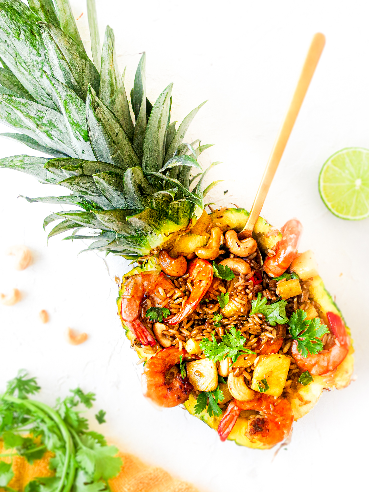 Thaise gebakken rijst met garnalen, ananas en cashew: tropischer wordt het avondeten niet. Zéker niet als je de rijst serveert in de lege ananas. Die hou je sowieso over (want het vruchtvlees gebruiken we voor de rijst), en zeg nou zelf: wie wil er nog uit een bord eten als je ook een ananas kunt uitlepelen?
