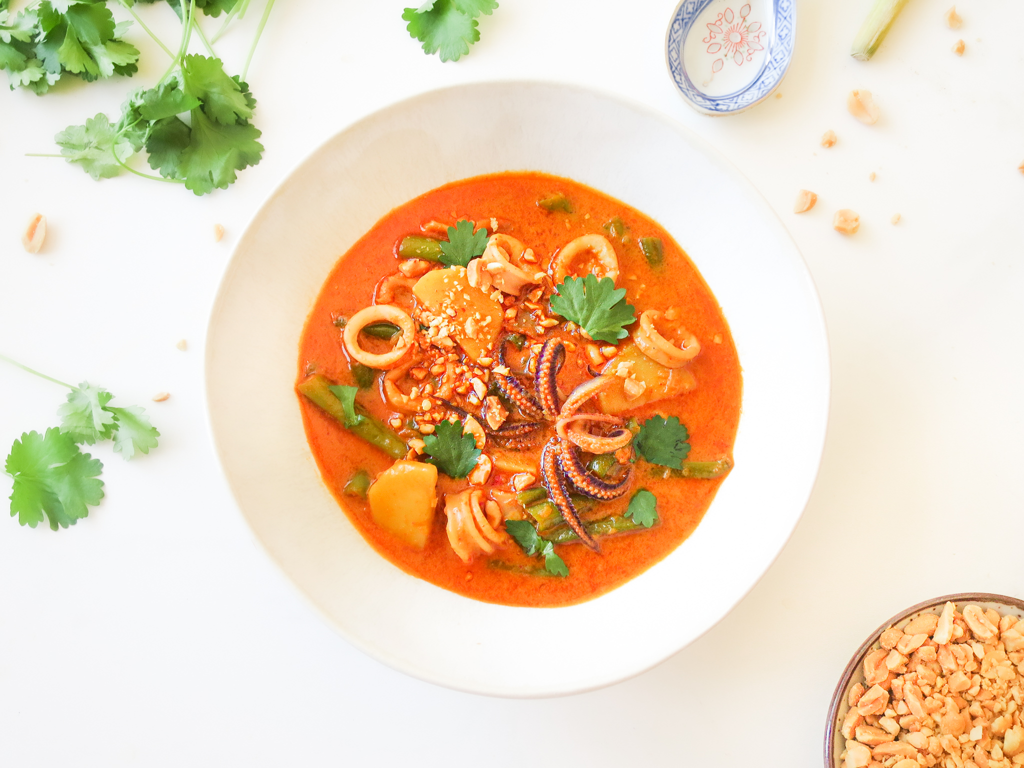Een lekkere Thaise rode curry maken is helemaal niet moeilijk. En wil je eens extra uitpakken bij je vrienden, voeg dan verse inktvis aan je curry toe. Daarvoor moet je even naar de viswinkel, maar geloof ons: het is het zóóó waard.