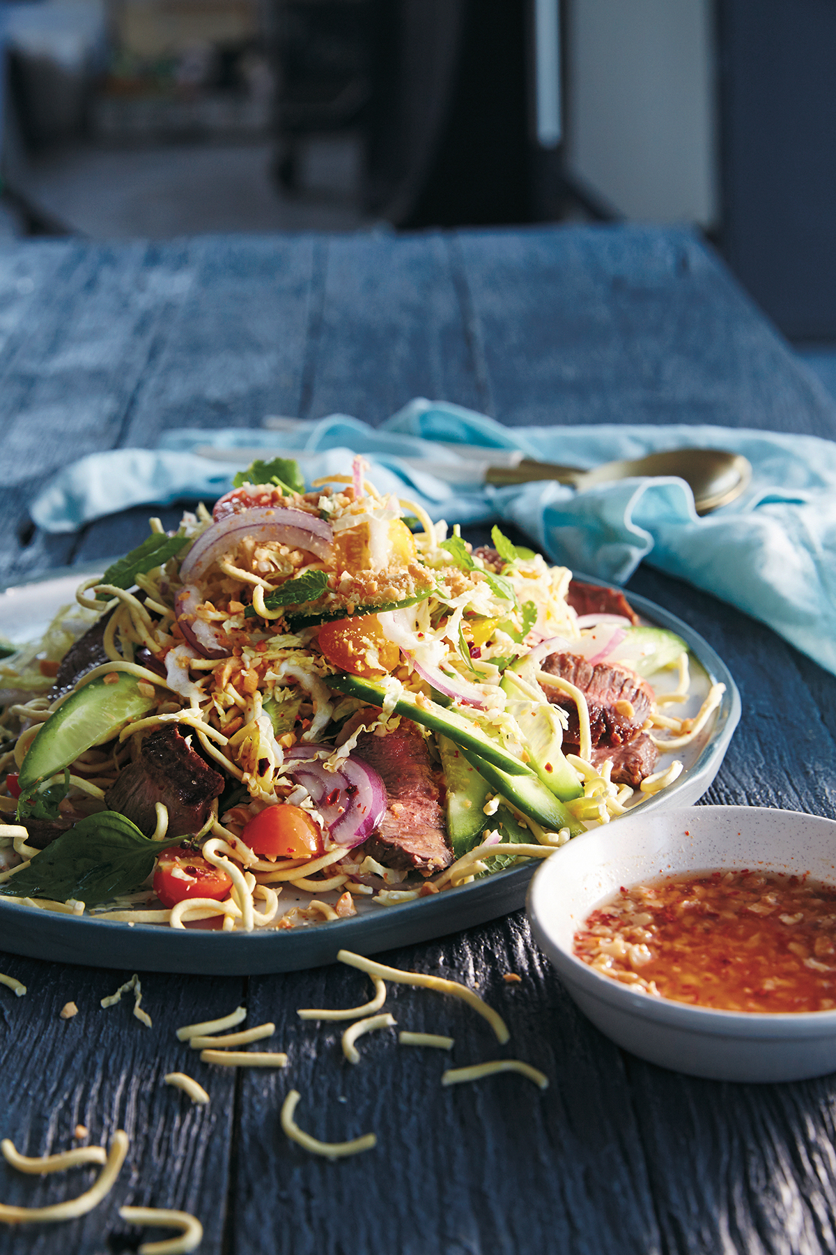 Voeg de biefstuk en dressing toe aan de salade en schep alles door elkaar. Voeg als laatste de noedels toe zodat ze niet zompig worden en schep erdoor. Of, nog beter: leg de helft van de salade op een platte schaal, bestrooi met de noedels en herhaal de lagen zodat de noedels knapperig blijven.