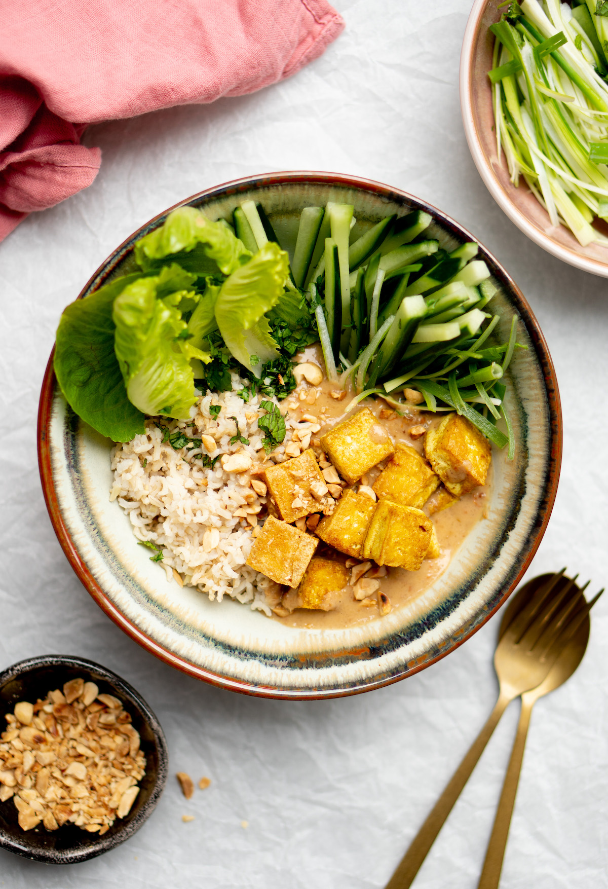 We hadden zin om weer eens een recept met tofu te maken. Maar dan wel krokante, perfect gebakken tofu (en niet de sponzige variant). Deze frisse Thaise saté-bowl bleek de perfecte match. We maken ‘m regelmatig met gebakken kippendijen, maar dankzij de kick ass saus vol smaak, is deze vega variant minstens zo lekker!