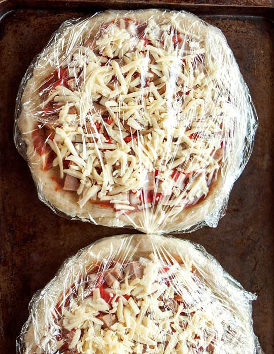 Het geheim van deze goddelijke pizza’s zit hem in twee dingen: je bakt de pizzabodem voor en pas dáárna maak je hem af met de topping. Dit zorgt voor een heerlijk knapperige bodem. Om te zorgen dat de pizza niet uitdroogt in de vriezer wikkel je hem eerst in plastic folie en vervolgens in een laag aluminiumfolie.