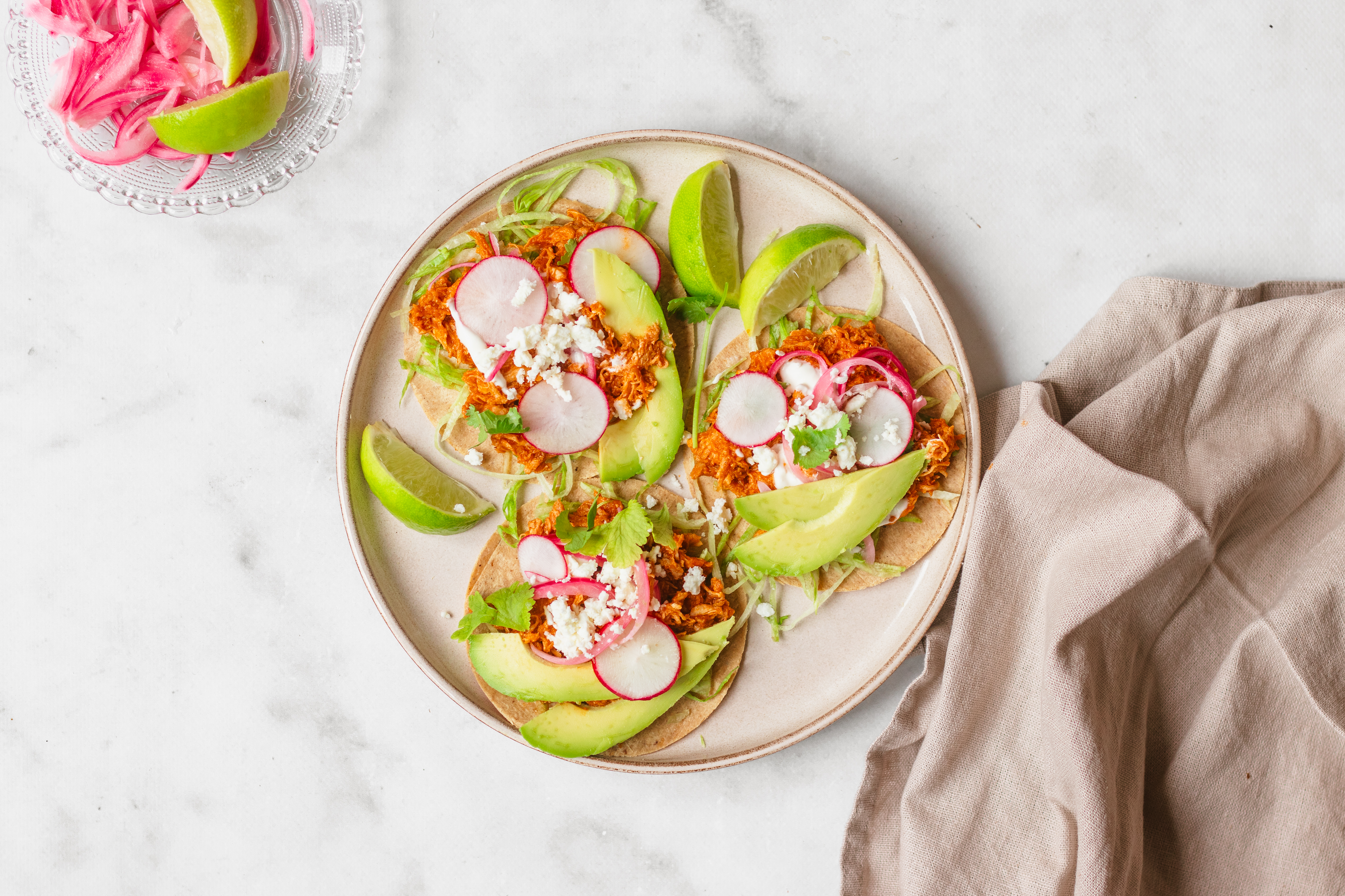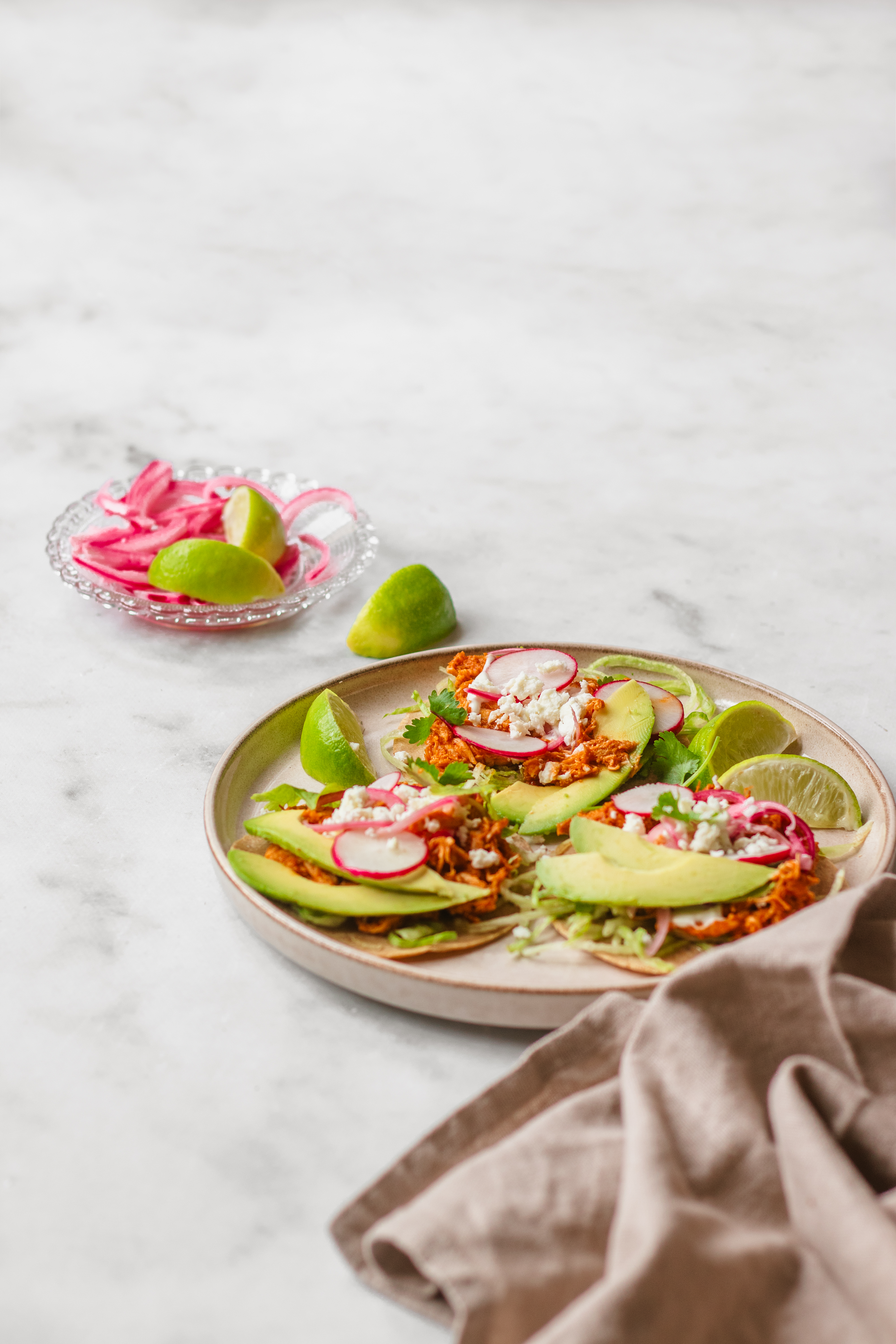 - Serveer de tinga de pollo met zure room, dungesneden ijsbergsla, plakjes avocado en radijsjes. Verkruimel feta erbovenop en maak af met partjes limoen. Niet traditioneel, maar wel lekker: ingelegde rode ui voor een frisse twist!