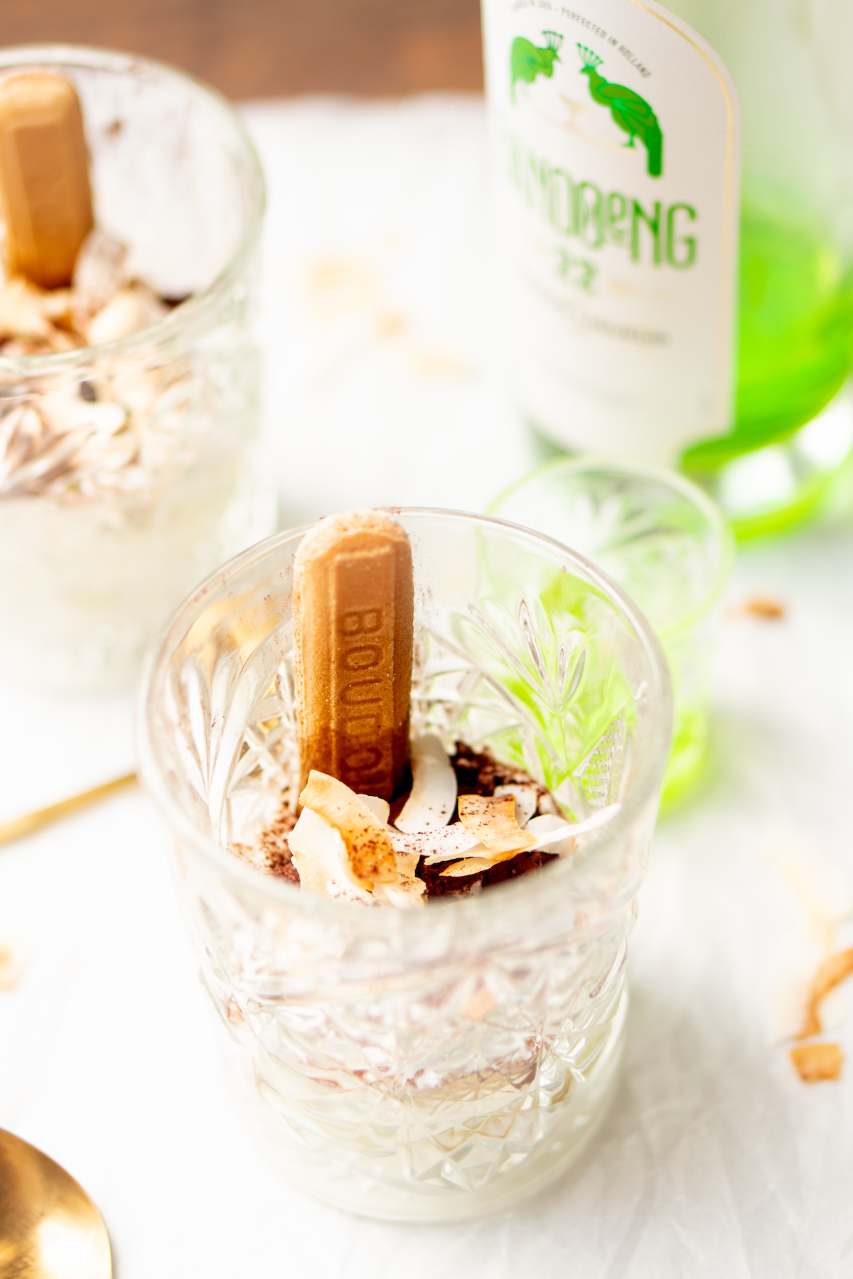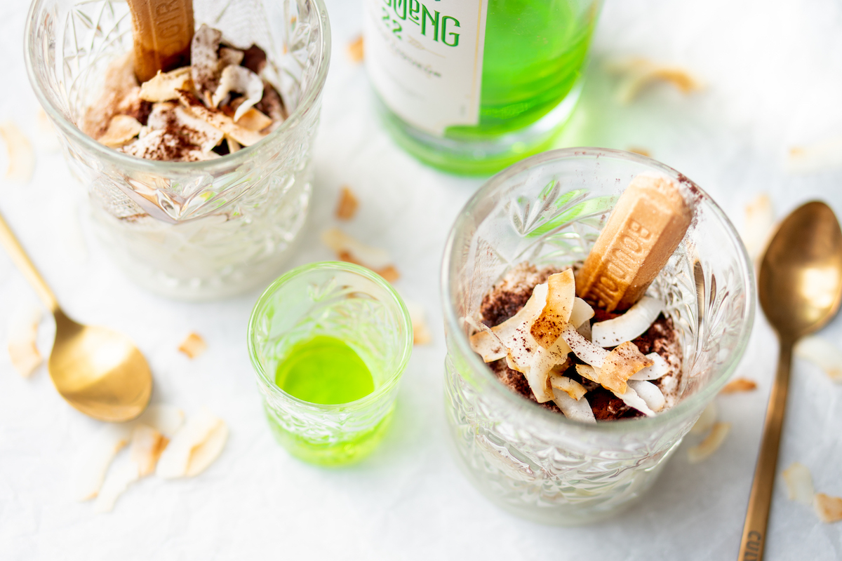 Die likeur jagen we er met gemak doorheen en dat zorgde ervoor dat we op het idee kwamen om er een recept voor tiramisu mee te maken. Een deel van de mascarpone vervingen we door luchtig opgeklopte kokosmelk, de drank door pandanlikeur. Kokosschaafsel maakt het helemaal af.