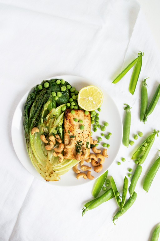 Marineer de cashewnoten in één eetlepel honing en de rest van de chili vlokken. Rooster ze vervolgens tien minuten in de oven tot ze krokant zijn. Neem de tofu uit de pan en ‘grill’ de sla, snijkant naar beneden, in dezelfde pan gedurende één minuut.