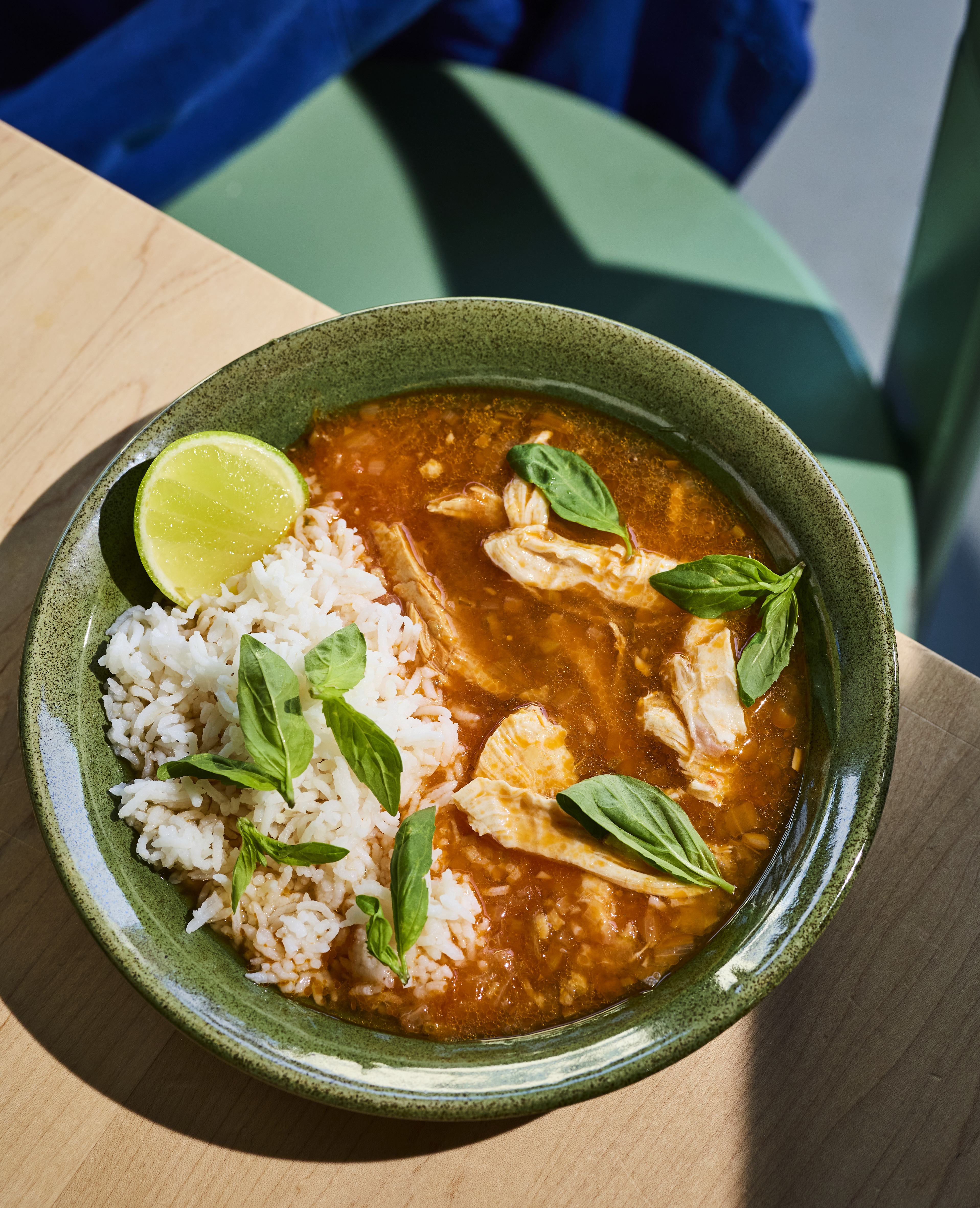 Een soep waar je van blijft eten: fris door de tomaat en limoen, kruidig door basilicum en gember, en met precies genoeg pit. De kip en geurige rijst maken het een lichte, maar toch vullende maaltijd. Je kunt de soep (ook met kip) invriezen; kook de rijst pas vlak voor het serveren.