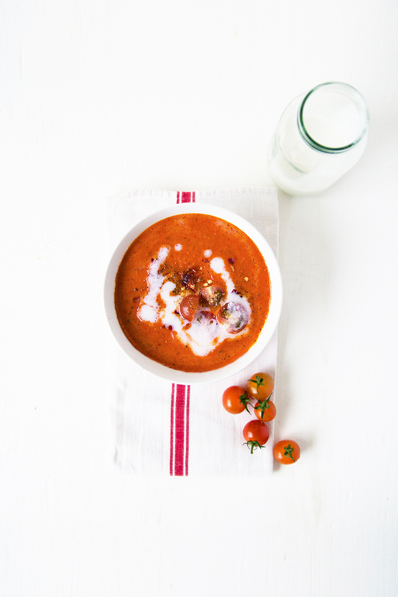 Tomatensoep is lekker, maar al helemaal als je de tomaten eerst roostert. Renée Kemps maakte deze smakelijke versie met geroosterde paprika en kokosmelk.