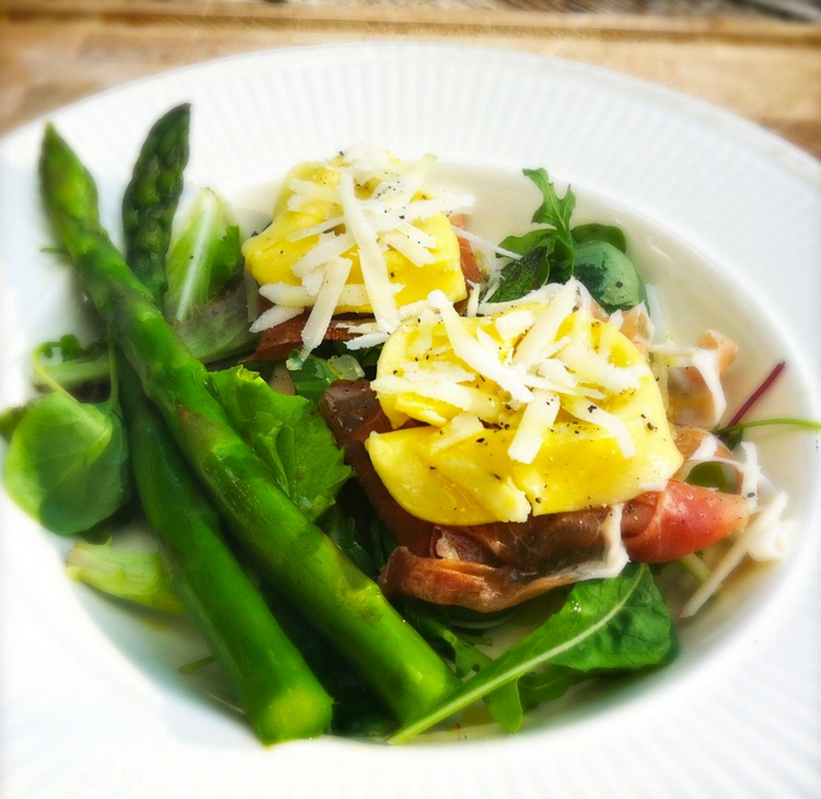 Giet de asperges en pasta af en plaats deze op de bordjes (van beide twee).
