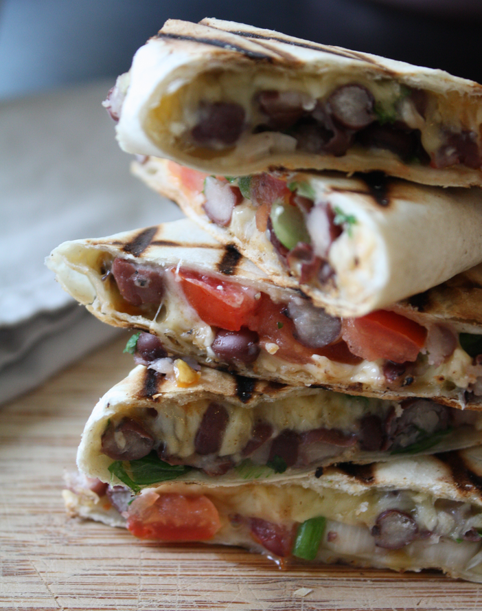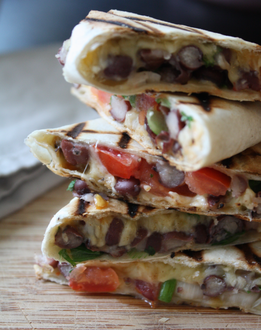 Leg nu een torilla op een plank, bestrooi de ene helft met kaas (ongeveer 1 cm van de rand vrijhouden) en schep daar boven op wat van het bonen mengsel. Doe er nog een klein beetje kaas boven op en vouw de tortilla dubbel. Druk goed aan en dan mag het in de (gril) pan gebakken worden voor ongeveer 2 min aan elke kant. Enjoy!